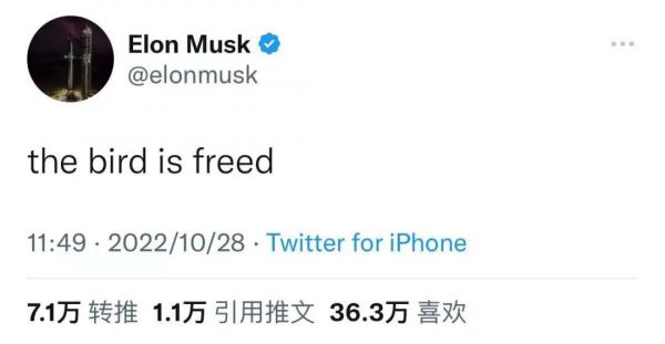美国当地时间10月28日上午,马斯克更新了一条推特:“这只鸟自由了。”推特的标志正是一只蓝色小鸟。而目前,马斯克已经抵达推特总部,并且将社交媒体上的个人简介更新为“推特老板”。