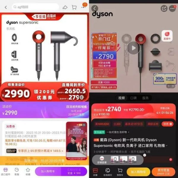 其他品类更是如此。以家电为例,网红产品戴森HD08红色吹风机在头部主播直播间使用200元优惠券后的到手价为2790元,但京东到手价仅需2740元,此类产品蹲守直播间明显并不划算。