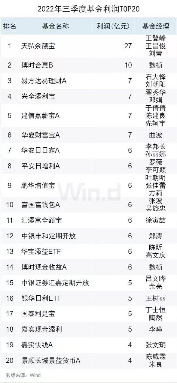 Wind数据显示,2022年三季度基金利润TOP20榜单,前二十名几乎都是货币基金。其中,天弘余额宝盈利27.48亿元,是唯一一只盈利超20亿元的产品,远远甩开排名在其后的博时合惠货币B和易方达易理财A,二者分别盈利10亿元和7亿元。
