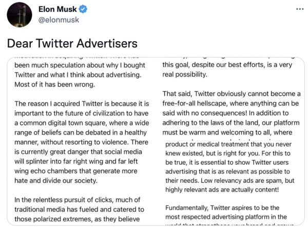 因此,在 Twitter 的「食堂」以新 Boss 的姿态,和员工亲切聊天之后。马斯克做的第一件事,就是在 Twitter 上发布了一封「致推特广告主」的公开信。