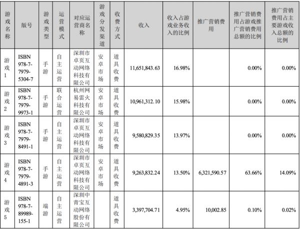 在半年报里,中青宝曾披露了5款主要运营游戏的具体收入,其中收入最高的游戏上半年营收约为1165.18万元,占游戏业务收入16.98%的比例。