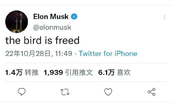 在个人推特上,马斯克用一句充满意味的“the bird is freed”暗示了推特易主的消息,随后更是用一封“致用户和广告商们的公开信”,无限拔高这次收购案的意义。