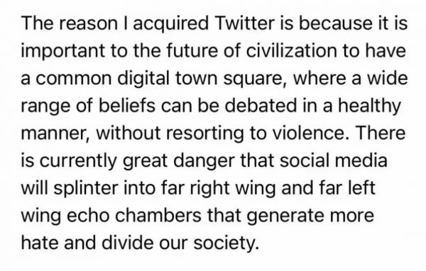 短短数句,既满足了用户们对于言论自由的需求,又满足了广告商们对于推广的需求,同时道出了自己收购推特的原因。
