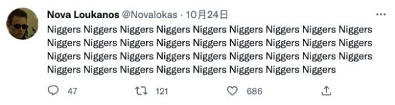 一些种族歧视言论已经在Twitter上快速发酵。一条推文发布了关于赞美纳粹德国的视频,被点赞了400多次;已经有新账号开始使用纳粹标志作为头像,并转发了马斯克和反犹太主义的推文;一个全文都是“Niggers”的推文被转发了120多次,点赞600多次,发布5天之后依然没有被删除。