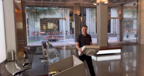 埃隆·马斯克最终还是走进了旧金山市场大街1355号大楼:他将自己抱着一个白色洗手盆进门的桥段拍成了一个视频,通过这栋大楼里某位工程师写下的代码,发送给了自己1.1亿个粉丝。