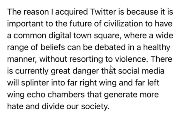 购买推特不是出于商业的考量, 而是基于未来数字文明发展与更好的人类文明规范。
