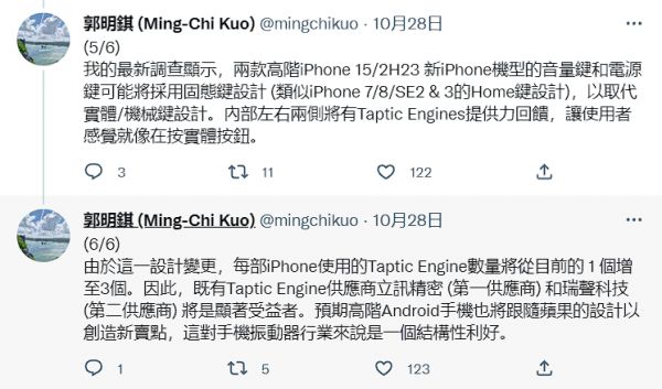 郭明錤发文表示,最新调查结果显示,iPhone 15的两款高端机型的音量键和电源键可能采用固态按键设计,并非目前这种可以按压下去的物理按键。不过,苹果会在左右两侧增加Taptic Engines振动马达提供反馈,让用户能获得与按下物理按键相同的感觉。这一设计就和iPhone 7上的固体Home键非常相似,应该能带给消费者全新的体验。郭明錤还预测,未来高端安卓手机可能也会跟进这一设计,这有利于振动马达行业发展。