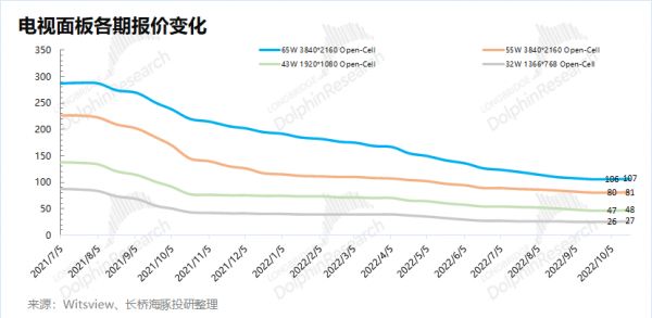 从Witsview 的10月底报价来看,65寸/55寸/43寸/32寸价格分别为107美金/81美金/48美金/27美金。价格仍处于面板周期底部,但本期面板价格是14个月下跌以来的首次全线上涨。