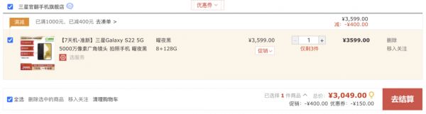 简单看了下,感觉三星官翻手机的折扣力度还是挺大的。以三星S22来说,基础款只要3599元,用券还能更低,最终3049元。当然,实际的价差没有这么夸张,全新三星S22目前的价格大概是3399元。这样看来,三星S22 7天机的真实优惠力度是350元。