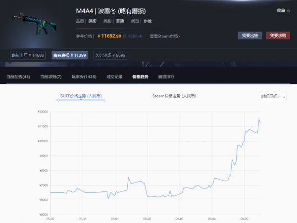 数据检测网站显示,最近一个月,国内饰品平均价格上涨幅度高达12%,换算成年增值率则超过了100%,而巴菲特的年收益率也不过20%,每月12%上涨的大盘,在股票市场也足以算得上牛市。