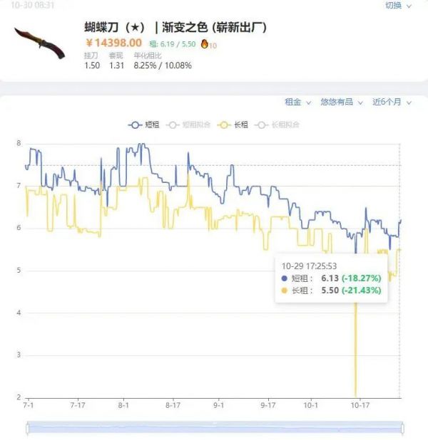 竞争激烈是最主要的原因。理论上,皮肤租赁几百元就能入场,门槛远低于大多数生意。供给端逐渐饱和之后,市场价格也一路下探,比如大火的“蝴蝶刀”,尽管价格上涨了一半,但出租价格却从每天12元降低到了6元,租售比只有原来的四分之一。