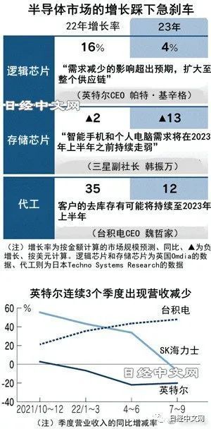 此前有旺盛需求支撑的半导体的繁荣周期正在恶化。由于个人电脑(PC)和智能手机等需求放缓,行情迅速恶化,美国英特尔和韩国三星电子等各大型企业的利润相继大幅下降。此外,美国的对华技术封锁等也造成打击,半导体市场面临的谷底有可能比以往更深。