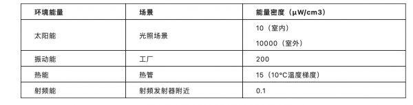 由于环境本身的特点,各类能量采集技术获得的能量密度差别很大,以下为典型场景下四类环境能量的密度[2]。