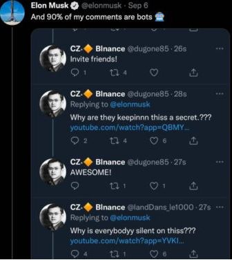 要说到推特的机器人账号问题,还有一个有意思的插曲。一个月前,马斯克(第N次)吐槽推特假帐号泛滥,这次他配上了一张截图,图里是一个“假赵长鹏”在马斯克评论区卖力兜售加密货币链接,边发链接还边问“为什么他们要对此保密?”