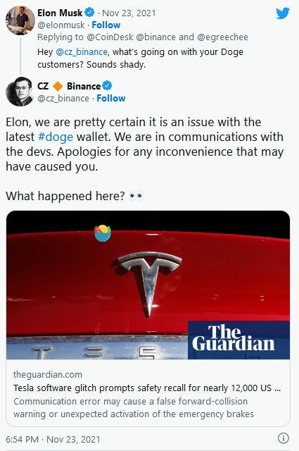 彼时,币安暂停狗狗币提款服务,马斯克为持有者们站出来“主持公道”,他发推特艾特币安的官推发难:“喂,你的狗狗币用户是怎么回事?听起来很可疑啊。”