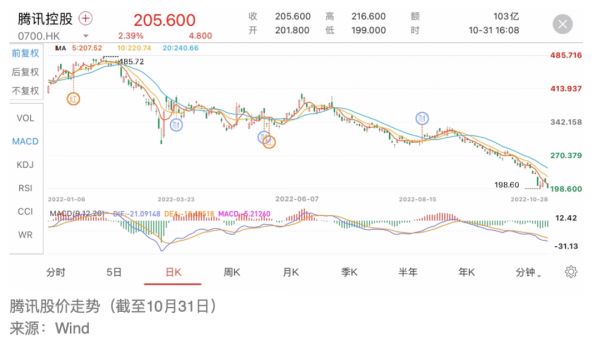 10月31日,腾讯收于205.60港元,股价年初至今下跌53.41%。