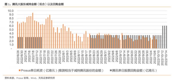 天风证券认为,接下来腾讯仍将延续较高水平的回购力度。该机构在10月17日的研报中指出,2022年6月28日至10月7日共74个交易日,腾讯大股东Prosus回购其自身股份以及购买Naspers股票的总金额接近42亿美元,对应约332亿港元,平均每日耗资约4.5亿港元。按照Prosus口径,其回购计划的资金来源为减持腾讯股份,因此一定程度可将Prosus回购量与减持腾讯股份量等同看待。