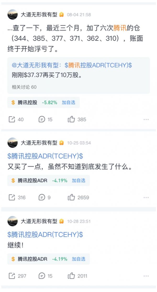 在腾讯的跌势中,段永平是出手加仓的人之一。据其名为“大道无形我有型”的投资平台账号8月4日透露,他曾于此前三个月六次加仓腾讯,买入时的价格均在300港元以上。而就在10月28日,他言简意赅地发文称“继续!”,暗示仍将继续抄底腾讯。