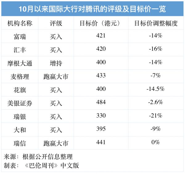 市场对于腾讯的底部情绪可谓纠结。据《巴伦周刊》中文版的不完全统计,自10月以来,国际大行纷纷给予腾讯“买入”、“增持”或是“跑赢大盘”评级,但多数机构下调了腾讯的目标价。