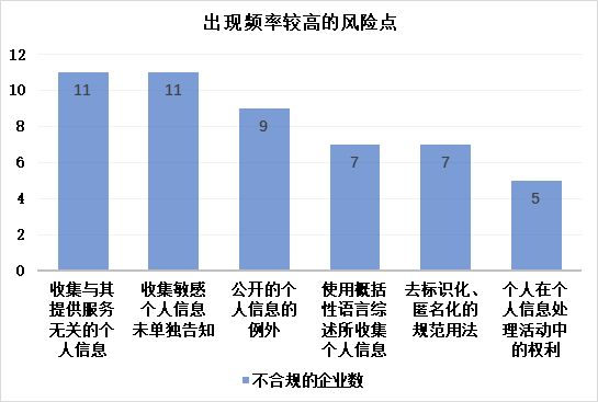 2、梳理选取的15款APP隐私政策文本对应的风险项及风险点,总结出实践中隐私政策文本风险频率出现较高的风险项及风险点。