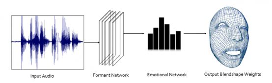 Voice2Face的具体工作原理如下:第一阶段,数据采集制作。这里主要包含两种数据,分别是声音数据和声音对应的动画数据。声音数据主要是录制中文字母表的发音,以及一些特殊的爆破音,包含尽可能多中发音的文本。而动画数据就是,在maya中导入录制的声音数据后,根据自己的绑定做出符合模型面部特征的对应发音的动画;第二阶段,主要是通过LPC对声音数据做处理,将声音数据分割成与动画对应的帧数据,及maya动画帧数据的导出;第三阶段,将处理之后的数据作为神经网络的输入,然后进行训练直到loss函数收敛既可。
