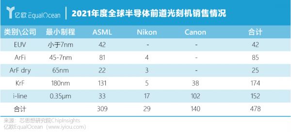 而2021年,ASML售出共EUV、DUV(包括ArFi、ArF Dry、KrF)、UV(i-line)五个类别光刻机共209台光刻机,其中高端EUV光刻机更是高达42台。在最高端的EUV领域,ASML占据了100%的市场;此外,在ArFi和ArF光刻机领域,也分别占据96%和88%的市场。