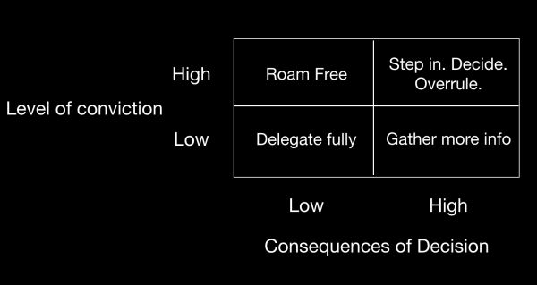 理想的情况下,随着时间的推移,你带领着你的直系下属,并在决策上扩展他们的能力,这样他们就会逐渐学会做出自己的判断。在任何特定的项目或决定上,你可以通过以下变量来进行分类:你的信念(conviction),即你是否认为自己知道正确答案或最好的最终产品;以及后果,即如果你做出错误的决定或产出了不完美的产品,是否有灾难性的后果。