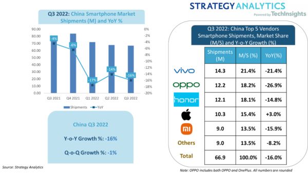 Strategy Analytics发布的数据显示,2022年三季度,中国智能手机出货量下降至6690万部,同比下降16.0%,同时也是出货量连续第六个季度出现同比下滑,“库存调整和宏观经济逆风导致需求减弱加重了喜忧上参半的业绩”。
