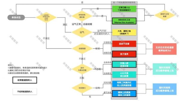 通过下图对一个女生在某一时刻可以遇到的所有异性,都进行了分类,我们可以看到,事实上真正的可选适婚男性很少。同时,随着女方年龄的增长,遇到同龄单身适合结婚的概率会越来越低。