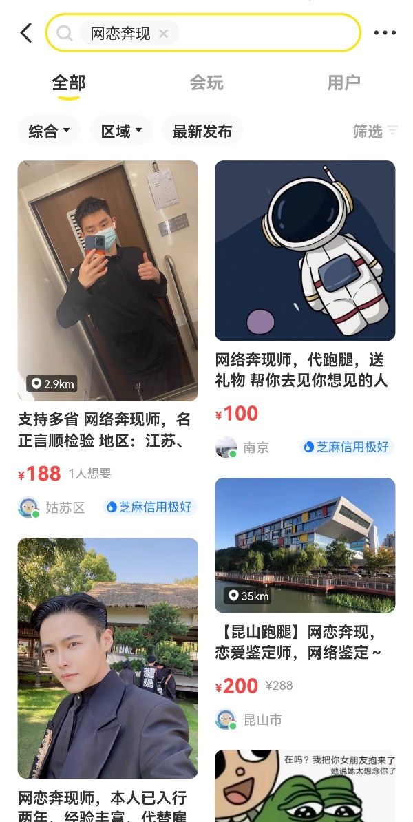在闲鱼上更是应运而生一种新的服务:网络奔现师。只要在闲鱼中搜索关键词网络奔现,就会搜索出相应的内容,主要提供网恋对象现场录制视频(考察颜值),代送礼物、甚至性别鉴定(以防萌妹变抠脚大汉)。网络奔现师的出现,是为了维持人们对网恋美好的幻想,以及避免各类翻车难受事件的出现,因此受到了一些年轻人的推崇。