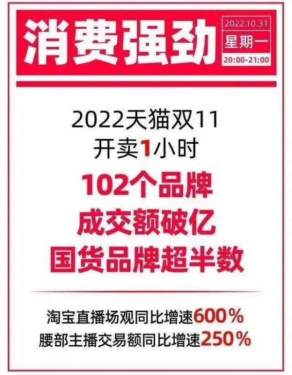 对这届“双11”无比积极的天猫,在今天上午给出了第一份成绩单。天猫官方宣布,今年共有102个品牌在开售1小时内达成成交额破亿,其中多个品牌创下自身历史新高。