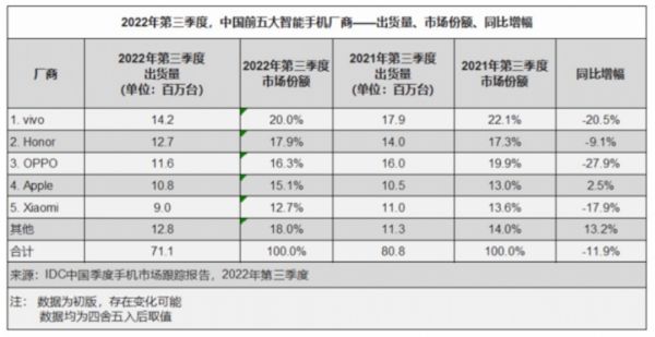 同时,在2021年Q3-2022年Q3的四个季度中,ov和小米的份额都出现了下滑,只有荣耀和苹果的份额还在上升。