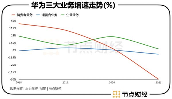 到了2021年,华为的手机业务被彻底挤出了行业第一梯队,消费者业务因此受到影响,其同年的收入同比大减49.6%至2434.31亿元,“第一大业务”的头衔也让给了运营商业务。而在2018年,该业务的同比增速曾高达45.15%。受此影响,华为2021年的总收入减少了29%至6368亿元。