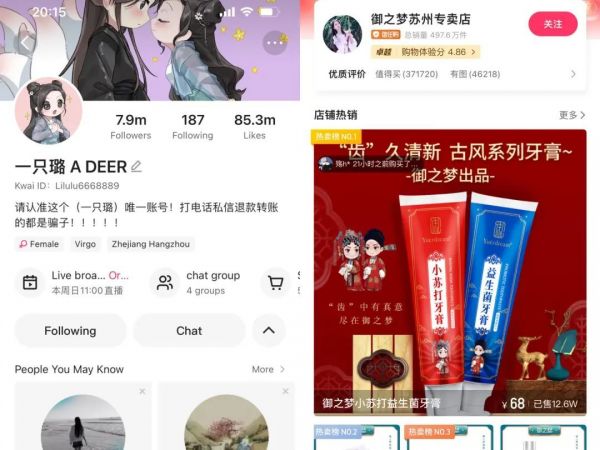 图/“一只璐 A DEER”个人主页(左)与剧集相关的品牌“御之梦”专卖店(右)来源/快手燃次元截图