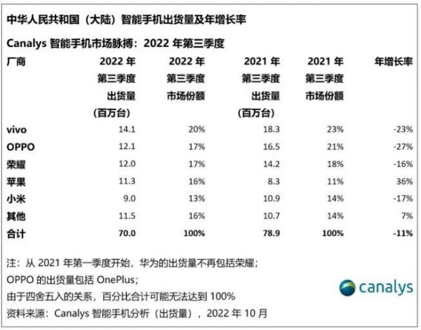 另据Canalys数据显示,国产厂商在国内出货量也都有一定程度下滑,据其报告显示,第三季度,vivo手机出货量为1410万台,同比降23%;OPPO手机出货量为1210万台,同比降27%;荣耀手机出货量为1200万台,同比降16%;小米手机出货量为900万部,同比降17%。