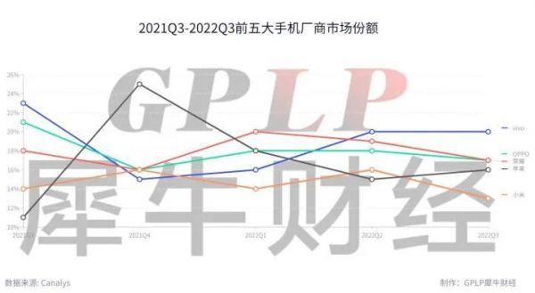 虽然和2021年第三季度相比,中国市场手机厂商市场份额排名变化不大,只有小米被苹果赶超市场份额排名下降一位,前三名的顺序并没有发声变化,但从往期数据看,2021年第四季度到2022年第三季度的一年时间里,手机市场围绕市场份额的争夺依然激烈。
