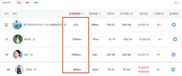 翻开灰豚数据10月31日(双11全面开启首日)的抖音带货榜,除贾乃亮以1亿+GMV、场观748.7w的成绩称霸榜单外,排在20名开外的黄圣依、吴昕、李国庆等明星主播与其销售成绩压根不在一个量级。