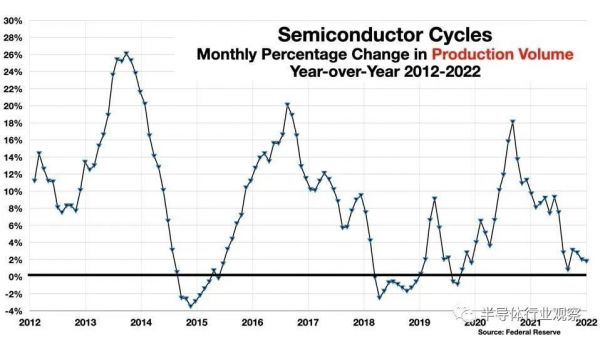 图2:2012-2022年半导体销量的同比变化百分比(图源:Forbes)