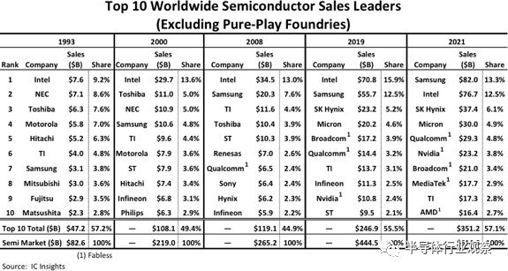 IC Insights统计的全球前十的半导体供应商(不含纯代工厂)排名的情况