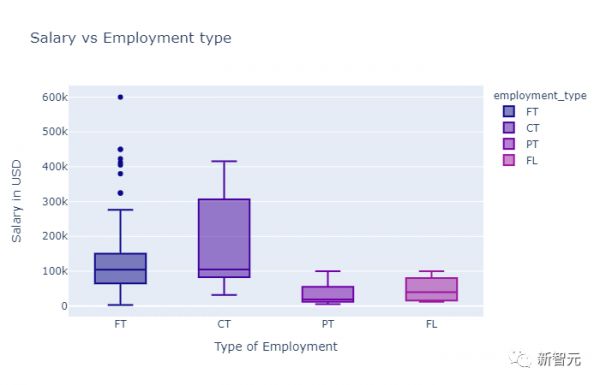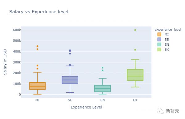 从这张图中可以发现,资历越高,工资越高。同时,总监级别的数据科学家之间的薪资差距远远大于其他级别的科学家薪资差距。