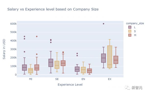 在上一张图的薪资水平对比的基础上,该图引入不同规模的公司,用来发现更多的信息。高级职位科学家的平均工资与总监级别的平均工资大体一致;在小公司,高级职位平均工资水平甚至与总监级别薪资持平。