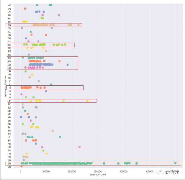 该图展示的是数据科学岗位的全球分布情况。可以看出,大多数工作机会都在美国,工作薪酬也最高(US)。此外,工作机会多、薪酬高的国家还有加拿大、日本、德国、英国、西班牙、法国、希腊和印度。