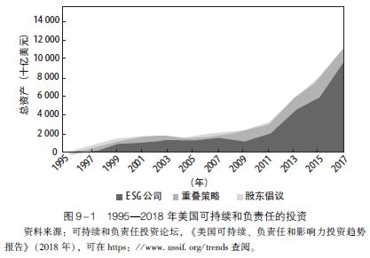 人们对ESG投资兴趣的急剧增加, 导致了ESG产品在各大投资公司的创建和普及。ESG投资方案正在吸引全球各类投资者, 包括个人投资者、财务顾问、资产管理公司和大型机构投资者。《ESG实践》一本书中列举了一些大型金融机构促进ESG投资的做法。2012年, 美国ESG资产总额为3.7万亿美元, 之后4年的年均增长率为135%。可持续和负责任投资论坛(US SIF, 2018)的一项研究估计, 采用SRI策略的美国AUM从2016年年初的8.7万亿美元增长到2018年年初的12.0万亿美元(见图9 -1)。