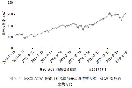 作为最大的资产管理公司, 贝莱德为客户提供了众多的ESG选择, 包括绿色债券, 可再生基础设施投资, 与SDGs相一致的主题战略, 可持续ETF (包括业内最大的低碳ETF和最大的可再生能源基金)。它将可持续投资和ESG 因素纳入其实物资产、全球房地产和基础设施投资。该公司还设计和构建了定制的阿尔法搜索和指数策略,涵盖上市公司股权和债务、私人可再生能源、大宗商品和实物资产。贝莱德认为, 没有必要为了社会问题而牺牲财务收益, 应该设计可扩展的投资解决方案来提高长期收益, 改善财务结果, 并有助于采用全球可持续的商业实践。正如之前所述, 贝莱德提供的指标显示, 许多可持续投资的财务表现与可比的传统投资相似。例如, 对于关注向低碳经济过渡的潜在风险的投资者, 有MSCI ACWI低碳目标指数。它以传统的MSCI ACWI指数为基础, 包括从23个发达市场和24个新兴市场中选出的大型和中型股票。该指数增加了碳排放相对较低的公司权重, 导致两个指数之间的碳强度差异为58% 。图9 - 4显示了MSCIACWI低碳目标指数对传统MSCI ACWI指数的密切跟踪。