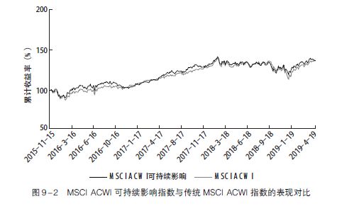 2018年, 机构投资者和资金管理者最关注的ESG问题是, 气候变化、冲突风险、烟草、枪支管制、人权、董事会问题和高管薪酬。为了解决这些问题, 投资选择已经远远超出了简单的撤资策略。有一些股票指数的构建可以反映传统指数的风险和收益状况, 但也可以用来支持具有积极ESG特征的公司。对于青睐绿色能源的投资者来说, 现在还有一些基准指数, 例如标准普尔全球清洁能源指数(S&P Global Clean Energy Index), 纳斯达克清洁绿色能源指数(NASDAQ Clean Edge Green Energy Index) 和世界替代能源指数( World Alternative Energy Index)。另一个有趣的指数是MSCI ACWI可持续影响指数, 为了有资格被列入该指数, 公司必须维持最基本的ESG标准, 并且至少50%的收益来自以下一种或多种“可持续影响” 类别, 包含营养产品、重大疾病的治疗、卫生用品、教育、经济适用房、中小型企业贷款、替代能源、能源效率、绿色建筑、可持续水资源以及污染预防。图9 -2显示了MSCI ACWI可持续影响指数的业绩表现与传统MSCI ACWI指数的接近程度。