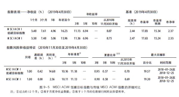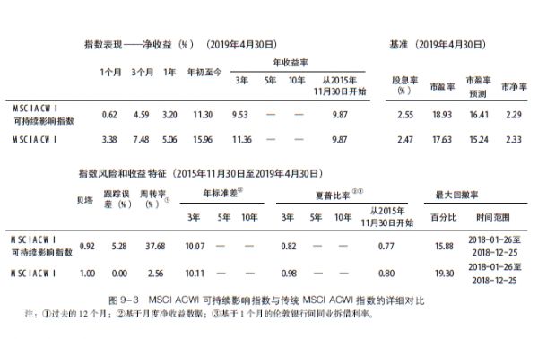 2016年, 传统MSCI ACWI指数的表现优于MSCI ACWI可持续影响指数(7.86%对4.64% ), 但MSCI ACWI可持续影响指数在2017年(27.45%对23.97% )和2018年比传统MSCI ACWI指数( -7.41%对-9.41% ) 均表现更好。图9 - 3给出了截至2019年4月这两个指数的风险和收益特征的更多细节。