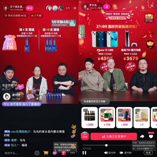 观察交个朋友的抖音、淘宝直播间,选品基本相同,都是白酒、电视、VR一体机等男性需求强的品,有的品在赠品和机制上做出区别,防止单个平台出现最低价。同时,交个朋友还邀请了笑果文化的脱口秀演员热场。