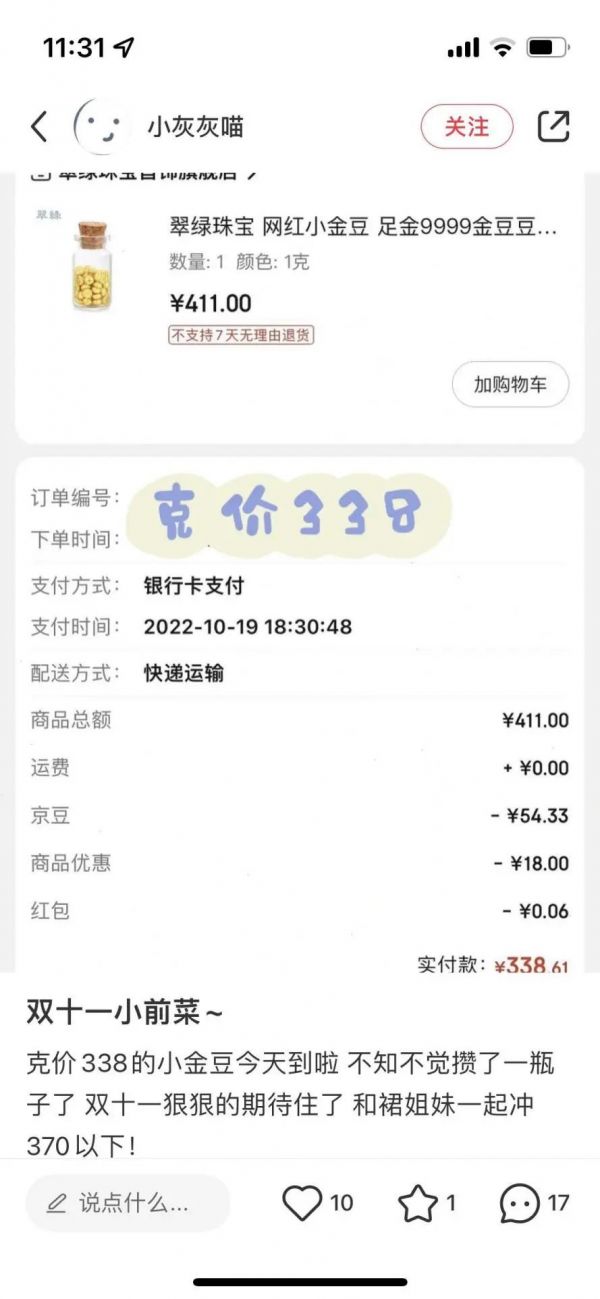 小红书ID为“换个名字”也表示,其买金豆纯粹就是为了积少成多,像是一种定期存款。
