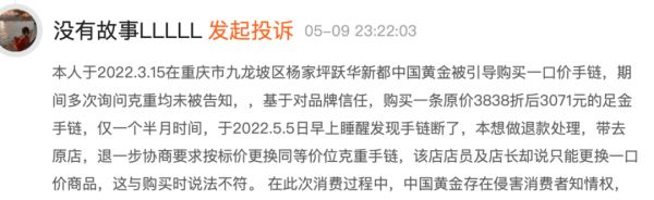 无独有偶,“没有故事LLLLL”也在黑猫投诉上表示,其被引导购买一口价手链,期间多次询问克重均未被告知,购买一个半月后手链断掉。