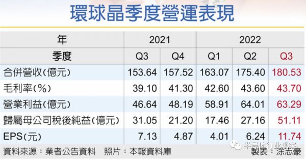 环球晶在11月1日的法说会表示,第三季营收180.53亿元,同步创下历史新高,且客户预付货款已达382.1亿元,写下历史新高纪录。环球晶董事长徐秀兰表示,短期电脑、手机、记忆体设备受消费者信心水准下降拖累,下半年可能持续疲软,但车用和数据中心则表现强劲,皆为半导体产业添加成长动能,加上各国政府积极擘划能源转型及净零碳排的相关政策,都有望持续推升半导体需求,支撑产业长期发展。
